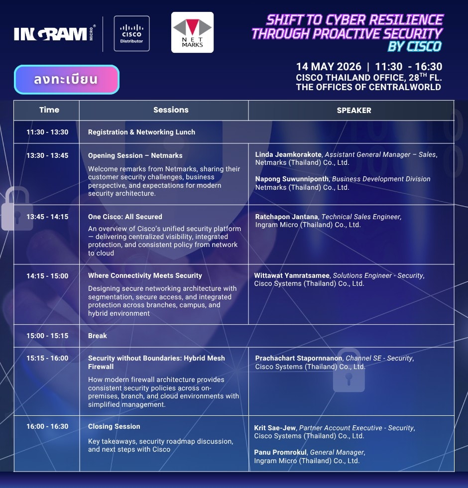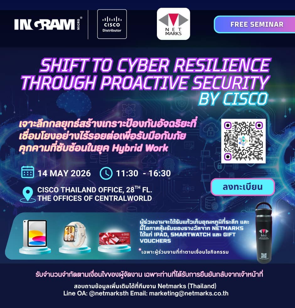 บริษัท เน็ตมาร์ค (ประเทศไทย) จำกัด ร่วมกับ บริษัท ซิสโก้ ซิสเต็มส์ (ประเทศไทย) จำกัด และ บริษัท อินแกรม ไมโคร (ประเทศไทย) จำกัด ขอเรียนเชิญท่านเข้าร่วมงานสัมมนา “Shift to Cyber Resilience Through Proactive Security by Cisco” เพื่อร่วมอัปเดตมุมมองและกลยุทธ์ด้าน Cyber Resilience ยุคใหม่ ที่จะช่วยให้องค์กรสามารถเสริมสร้างเกราะป้องกันทางไซเบอร์ได้อย่างชาญฉลาด ครอบคลุม และเชื่อมโยงกันอย่างไร้รอยต่อ พร้อมรับมือกับภัยคุกคามที่มีความซับซ้อนมากขึ้นในยุค Hybrid Work ได้อย่างมั่นใจและมีประสิทธิภาพ