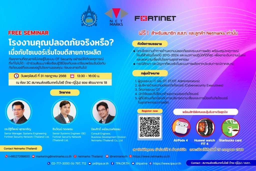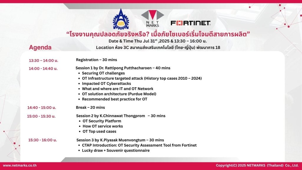 Netmarks ร่วมกับ สมาคมส่งเสริมเทคโนโลยี (ไทย-ญี่ปุ่น) และ Fortinet จัดสัมมนาหัวข้อ “โรงงานคุณปลอดภัยจริงหรือ? เมื่อภัยไซเบอร์เริ่มโจมตีสายการผลิต” ที่จะพาคุณเจาะลึกถึงความท้าทายด้านความปลอดภัยในระบบการผลิต พร้อมศึกษากรณีโจมตีสำคัญตั้งแต่ปี 2010-2024 และการวางแนวทางปฏิบัติที่ดีที่สุดในการยกระดับความมั่นคงและลดความเสี่ยงในโรงงานอุตสาหกรรม
