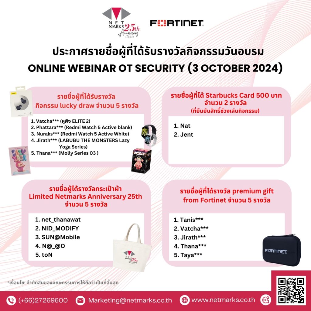 🎉 āļ›āļĢāļ°āļāļēāļĻāļĢāļēāļĒāļŠāļ·āđˆāļ­āļœāļđāđ‰āļ—āļĩāđˆāđ„āļ”āđ‰āļĢāļąāļšāļĢāļēāļ‡āļ§āļąāļĨāļāļīāļˆāļāļĢāļĢāļĄāļ§āļąāļ™āļ­āļšāļĢāļĄ Online Webinar OT Security (3 October 2024)🎉
