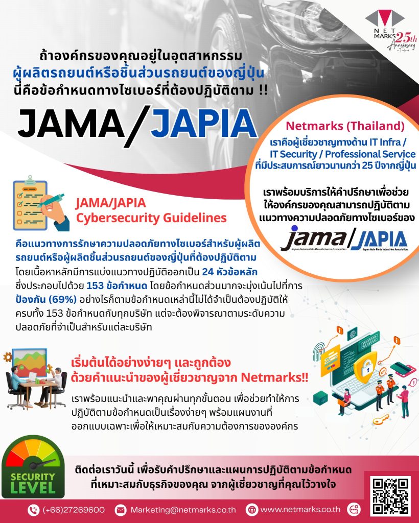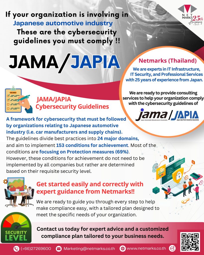 หากคุณเป็นหนึ่งในองค์กรผู้ผลิตรถยนต์หรือชิ้นส่วนรถยนต์ของญี่ปุ่น การปฏิบัติตามแนวทาง JAMA/JAPIA Cybersecurity Guidelines เป็นเรื่องสำคัญที่คุณไม่ควรมองข้าม! เพื่อให้เข้าใจมากขึ้นสามารถตามอ่านบทความเกี่ยวกับ JAMA/JAPIA ได้ที่ JAMA/JAPIA คืออะไร ทำไมถึงสำคัญกับอุตสาหกรรมยานยนต์?