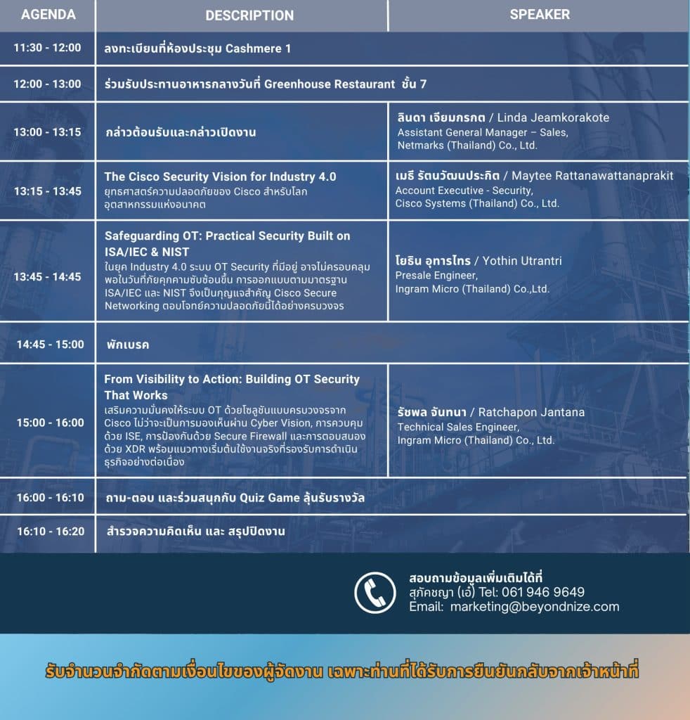 AGENDA ในงานสัมมนา เสริมพลังป้องกัน OT: อนาคตไซเบอร์ซีเคียวริตี้ สำหรับโรงงานและอุตสาหกรรม