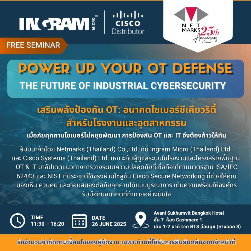 Netmarks ร่วมกับ Ingram Micro และ Cisco System จัดงานสัมมนา “Power Up Your OT Defense” – The Future of Industrial Cybersecurity อัพเดทเทรนด์อนาคตของไซเบอร์ซีเคียวริตี้ สำหรับโรงงาน และโครงสร้างพื้นฐานโดยเฉพาะ (OT & IT)