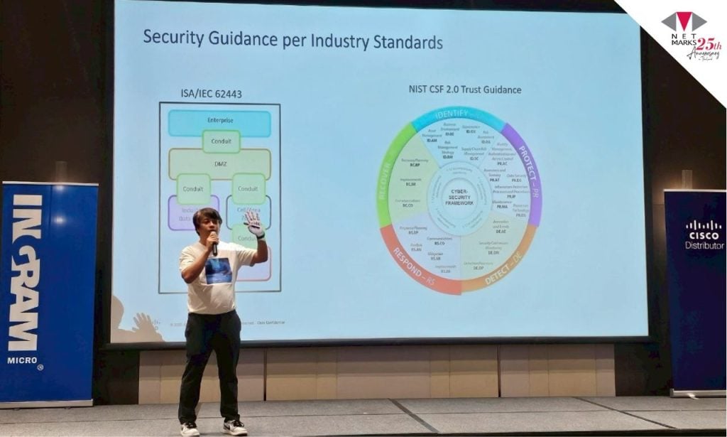 จากนั้น คุณโยธิน อุทาไทร Presale Engineer จาก Ingram Micro ขยายมุมมองในหัวข้อ “Safeguarding OT: Practical Security Built on ISA/IEC & NIST” โดยชี้ให้เห็นว่าระบบ OT Security แบบเดิมอาจไม่เพียงพออีกต่อไป ท่ามกลางภัยคุกคามที่ซับซ้อนขึ้น การออกแบบระบบตามมาตรฐานสากลจึงเป็นกุญแจสำคัญ และ Cisco Secure Networking ก็พร้อมตอบโจทย์นี้ได้ครบถ้วน