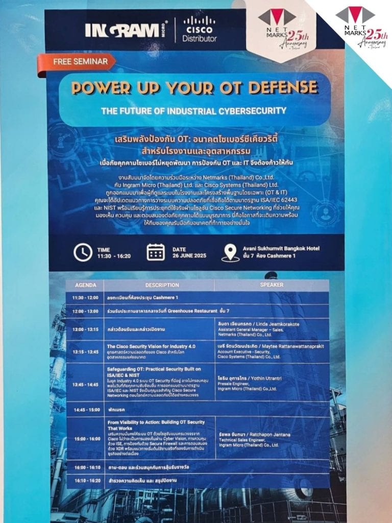 Netmarks ร่วมกับ Ingram Micro และ Cisco System ได้จัดงานสัมมนา “Power Up Your OT Defense” – The Future of Industrial Cybersecurity เมื่อวันพฤหัสบดีที่ 26 มิถุนายน 2568 ที่ผ่านมา ณ ห้อง Cashmere 1 ชั้น 7 โรงแรม Avani Sukhumvit Bangkok Hotel