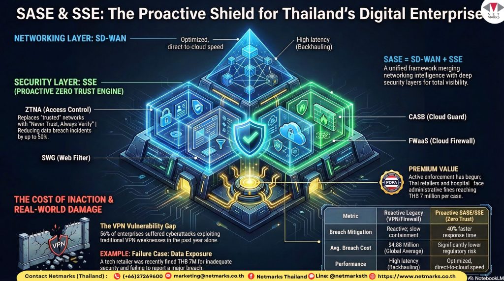 4. ความคุ้มค่าของการลงทุน (ROI) และการรอดพ้นกฎหมาย PDPA สถิติระบุว่ากว่า 56% ขององค์กรเคยถูกโจมตีผ่านช่องโหว่ของ VPN ยิ่งไปกว่านั้น ประเทศไทยมีการบังคับใช้กฎหมาย PDPA อย่างจริงจัง โดยมีกรณีธุรกิจค้าปลีกไอทีถูกปรับสูงถึง 7 ล้านบาทจากเหตุข้อมูลรั่วไหล การลงทุนใน SASE จึงไม่ใช่รายจ่าย แต่เป็นการปกป้องงบประมาณและชื่อเสียงขององค์กร อีกทั้งยังช่วยลด TCO (Total Cost of Ownership) ด้าน IT ลงได้ถึง 20-30% ในระยะยาว
