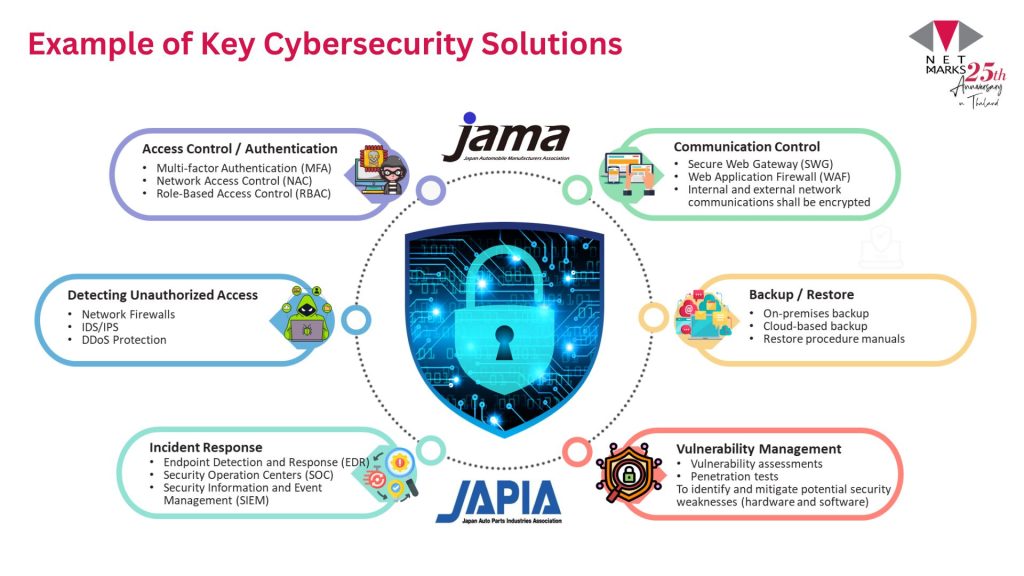 เพื่อช่วยให้ลูกค้าเข้าใจและดำเนินการได้อย่างมีประสิทธิภาพ Netmarks พร้อมเป็นพันธมิตรในการเสริมสร้างความมั่นคงทางไซเบอร์ให้กับองค์กรของคุณ ทีมผู้เชี่ยวชาญของเราจะให้คำแนะนำและสนับสนุนในการนำมาตรการ ควบคุม นโยบาย และเทคโนโลยีที่จำเป็นมาใช้ เพื่อให้สอดคล้องกับมาตรฐาน JAMA/JAPIA ไม่ว่าคุณจะเริ่มต้นจากจุดไหน เราจะช่วยเสริมสร้างความมั่นคงทางไซเบอร์ ป้องกันภัยคุกคาม และลดความเสี่ยงจากการโจมตีไซเบอร์ในอุตสาหกรรมยานยนต์อย่างมีประสิทธิภาพ เพื่อให้องค์กรของคุณปลอดภัยและพร้อมรับมือกับภัยคุกคามในอนาคต 💼✅
