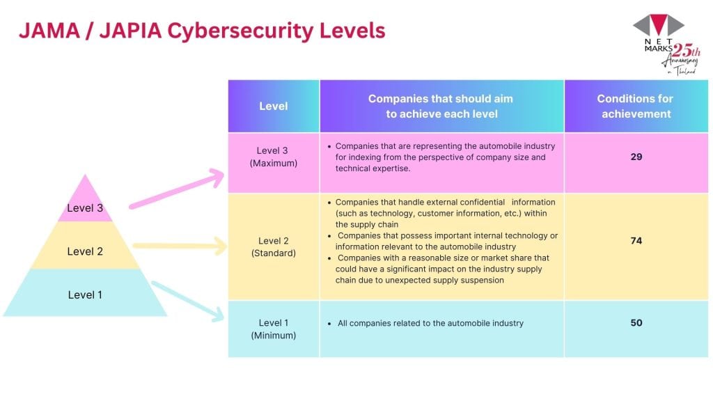 แนวทางการรักษาความปลอดภัยไซเบอร์ของ JAMA/JAPIA (ที่ประกอบด้วย 153 ข้อกำหนด) ได้แบ่งออกเป็น 3 ระดับความปลอดภัยไซเบอร์ เพื่อให้ง่ายต่อการนำไปใช้และส่งเสริมให้ทุกองค์กรในอุตสาหกรรมยานยนต์สามารถนำไปปฏิบัติได้
