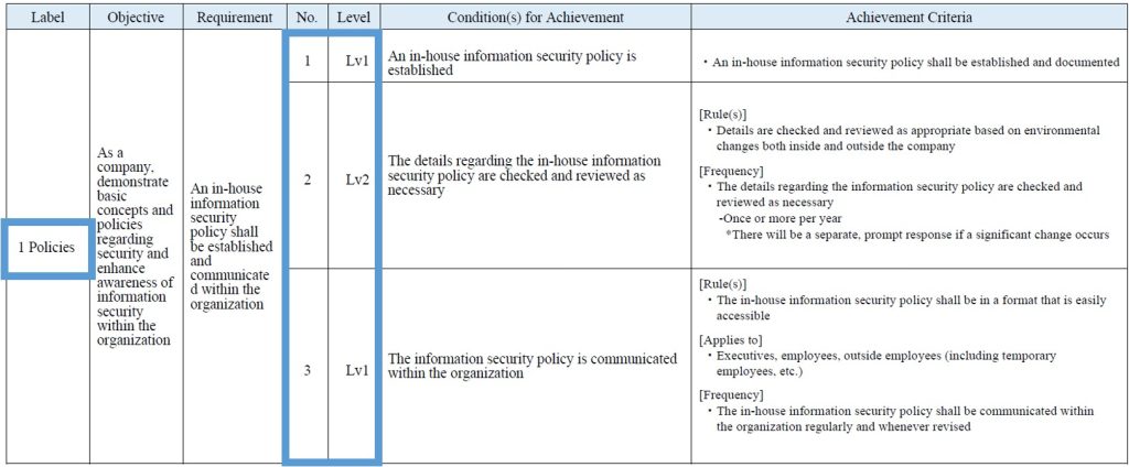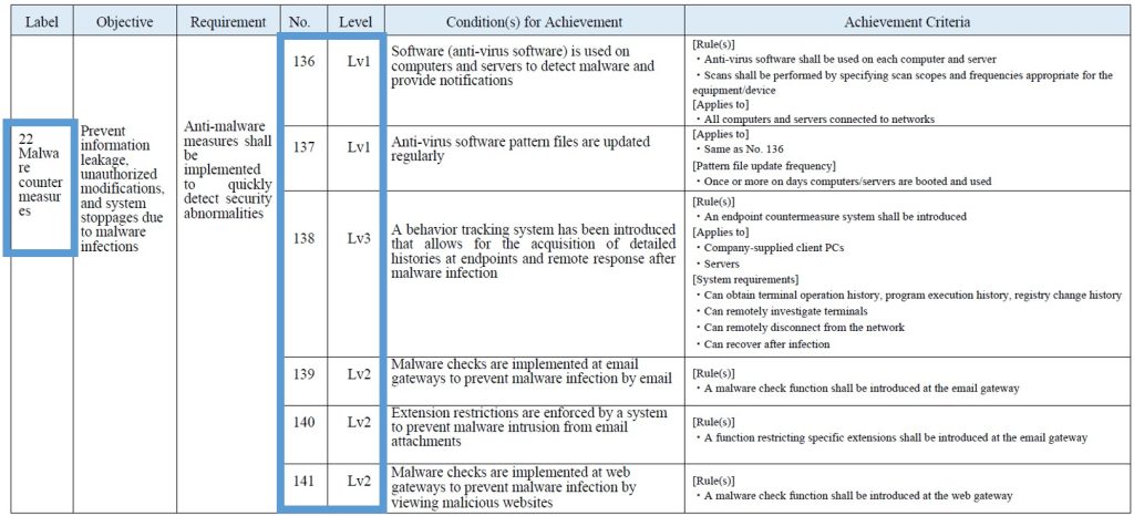 ข้อกำหนดสำหรับการบรรลุเป้าหมายในแนวทางการรักษาความปลอดภัยไซเบอร์ของ JAMA/JAPIA มีหลายข้อที่บริษัทต้องปฏิบัติเพื่อให้บรรลุระดับความปลอดภัยที่ต้องการ ตัวอย่างของข้อกำหนดเหล่านี้ ได้แก่