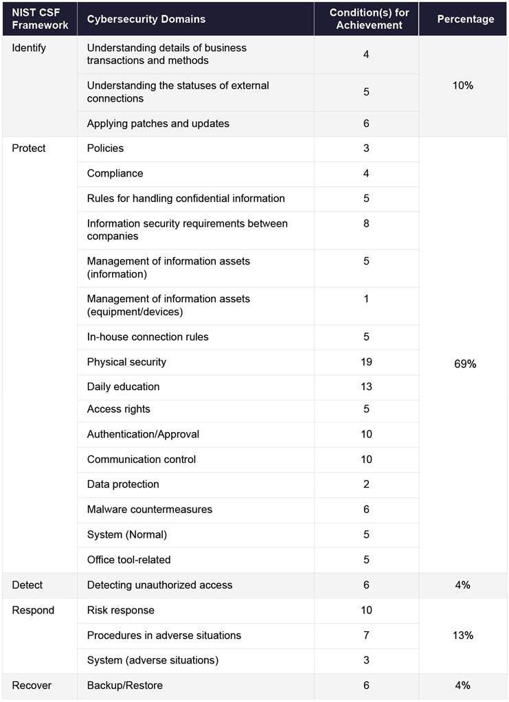 แนวทางการรักษาความปลอดภัยไซเบอร์ของ JAMA/JAPIA แบ่งแนวทางปฏิบัติที่ดีที่สุดออกเป็น 24 ด้านหลัก โดยมีเป้าหมายเพื่อให้บรรลุวัตถุประสงค์ด้านความปลอดภัยหลายประการ และมี 153 ข้อกำหนด ที่ต้องปฏิบัติเพื่อให้บรรลุเป้าหมายดังกล่าว ส่วนใหญ่ของข้อกำหนดจะมุ่งเน้นไปที่ การป้องกัน (69%) อย่างไรก็ตาม ข้อกำหนดเหล่านี้ไม่ได้จำเป็นต้องนำไปใช้กับทุกบริษัท แต่จะต้องพิจารณาตามระดับความปลอดภัยที่แต่ละบริษัทต้องการ